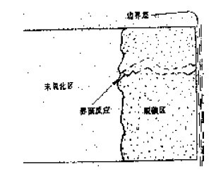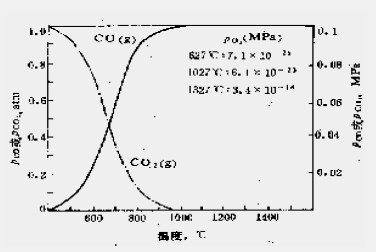 即 碳的直接氧化,即石墨在高溫下由于與空氣(O2)、水蒸汽(H2O)和碳酸氣等共存而被氧化。石墨在560℃以上就開始顯著氧化而使含碳制品脫碳損耗,由 圖可以看出右邊部分已被氧化成為脫碳區(qū),在脫碳區(qū)中由于碳的氧化而形成了許多擴散通道,氧氣和熔渣通過擴散通道進入磚內,在界面處和碳反應,反應產(chǎn)物通過 擴散通道擴散出去。由下圖可以看出在1000℃時,系統(tǒng)中主要以CO氣體形式存在,Pco≈0.1Mpa,生成的CO氣體向外擴散,阻止了O2及其它氣體 的進入,從而起到氣態(tài)“抗氧化劑”效果,所以碳是能夠穩(wěn)定存在的,但出鋼后冷卻過程中有可能被空氣氧化。同時含碳制品襯磚表面上附有渣層,可防止由空氣引 起碳的氧化,起到保護膜的作用,這種保護作用在1000℃以上特別明顯。